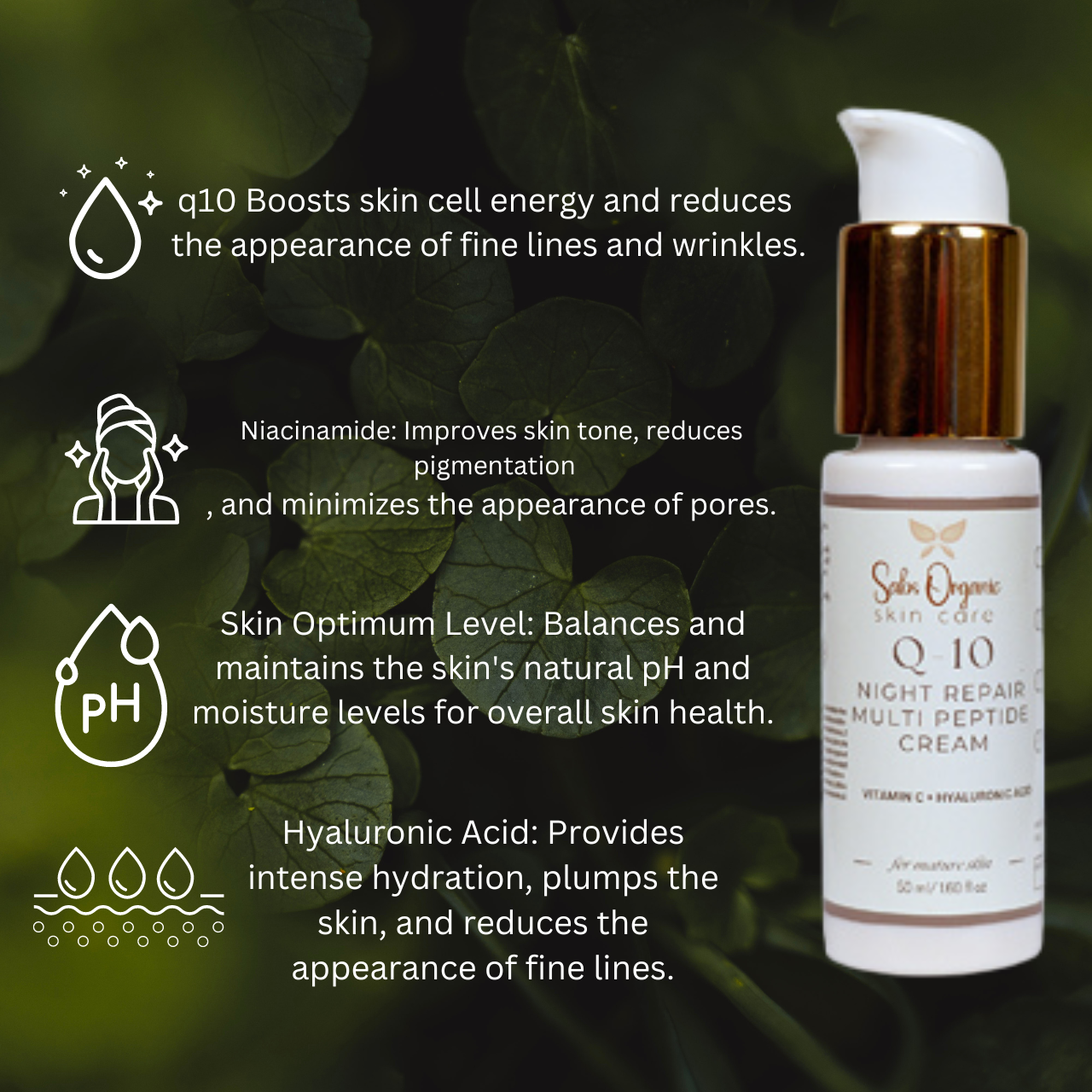 The Q10 Multi Peptide Anti-Aging Cream is packed with ingredients that hydrate and rejuvenate your skin. Hyaluronic Acid and Q10 work together to provide long-lasting moisture, leaving your skin soft and supple.
